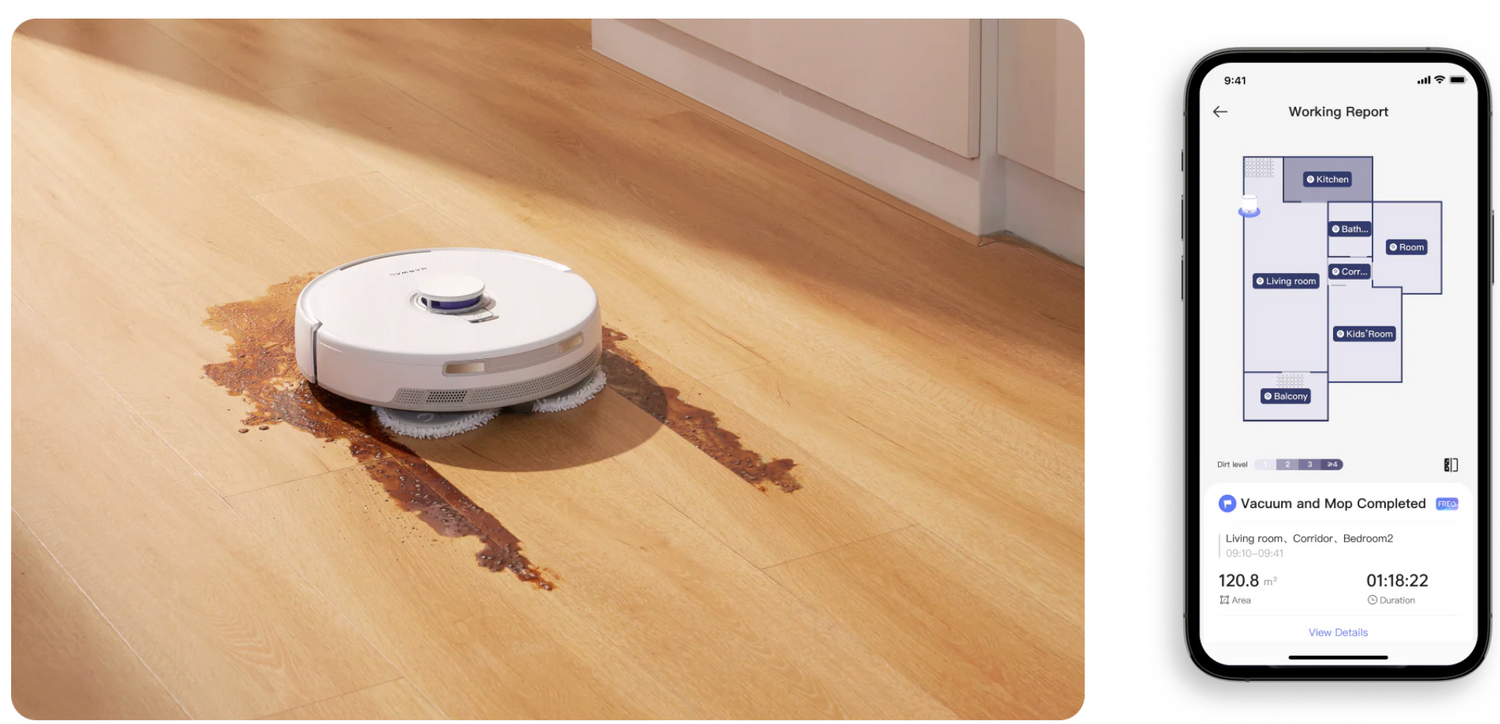 Le Freo X Ultra détecte automatiquement les zones très sales et intensifie son nettoyage. Comme sur la photo où il s'attaque à un renversement, il applique une pression renforcée et prolonge son action jusqu'à élimination complète de la saleté. Vous recevez ensuite un rapport détaillé avec surface nettoyée et temps de cycle.